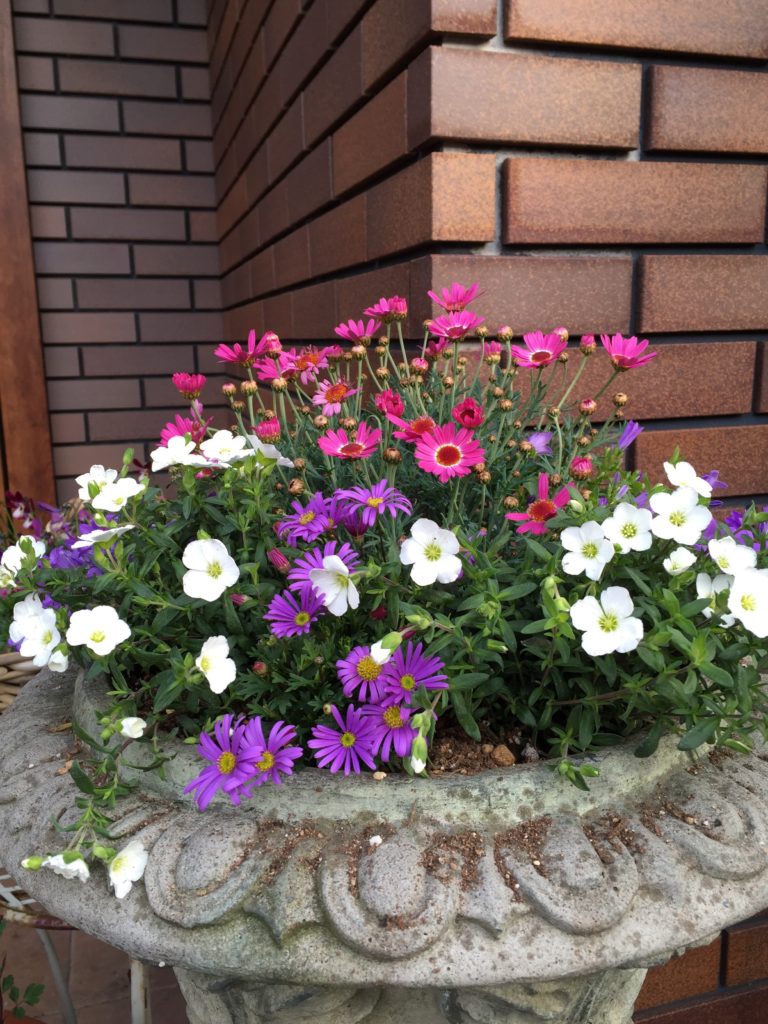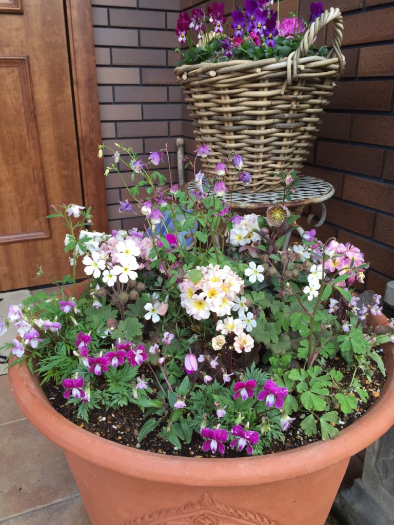 玄関の寄せ植えが、雪で傷んでしまったので、春らしく植え替えました。始めのは、隊長さん作、私好みの色でラブリーに植えてもらいました。後は隊長さんと花を選んで自分で植えてみました。出来上がりをアドバイスしてもらい落ち着きました!