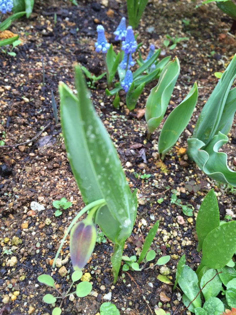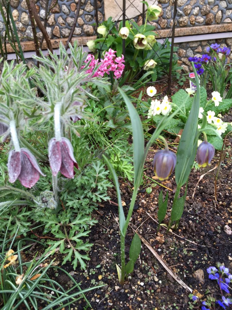 笹みたいな小さな葉っぱ、何の球根だったのかな?と思ってたら、フィリチラリアでした。暖かくなって、急に伸びて花がさきました。とっても可愛いです。花の下に親指姫がいるみたいです!