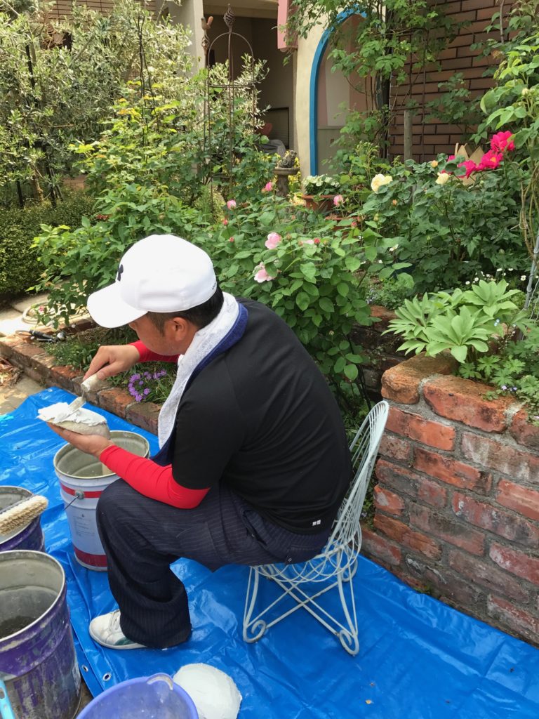 隊長さんのチームの一人のぬりかべさん、今日1日ケーキやさんのように白いクリーム塗り?をしていました。ピンクの薔薇、ルドゥテの香りに包まれて、、。この白いケーキは何になるのかな?できたらまた報告します!