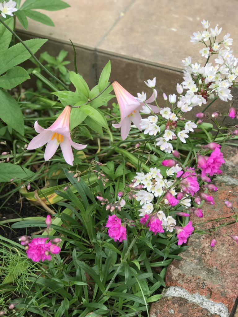 高校2年生の娘が6年生の時選んだ、姫ササユリ!あれから毎年咲いてくれます。あまり大きくならず、さりげなく愛らしく咲きます。手前のピンクの花も娘が植えたものです。なかなか良いセンスをしていますよ。