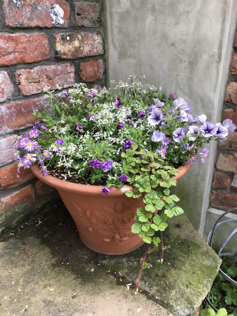 自宅の寄せ植えです。ピンクのスカビオサが可愛く、風に揺らいで咲いている姿はうっとりです。ブルーの寄せ植えは涼し気で薔薇の季節によく合うと思います。隊長作です。素人にはなかなかこんな組み合わせはできません。