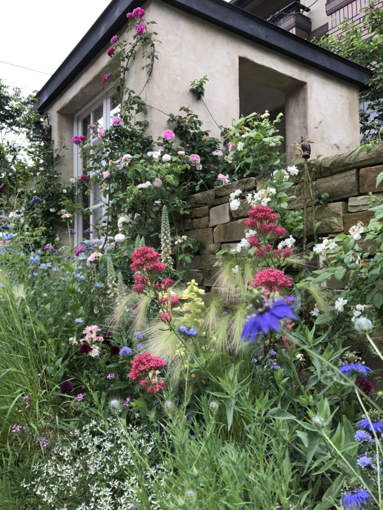 薔薇も終わりに近づきました。これは、自宅です。小屋のあたりが良い雰囲気になりました。キャプテン ジョン イングラム、フェリシテ パーマンティエ、エキウム、タータンムギ、ニゲラ、よく見るとまだ色々咲いてます。タータンムギは、朝陽にライムグリーンに輝き、夕陽には黄金色にキラキラ綺麗です。穂がでるまでは、草みたいでしたが、素敵なシーンを演出してくれています。収穫してパンが焼けるかな?