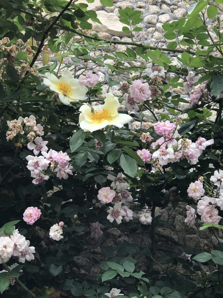 デビュタントの中にポツンと黄色い一重の薔薇が咲いてます。モネの愛したマーメイドです。遅咲きなので、米子では暑さに向かって咲くので、可哀想です。8月にイギリスのコッツウォルズで見たマーメイドは、色も日本のマーメイドより深く、花びらも厚かった気がしました。最近の米子は5月でも30度くらいになるので、薔薇たちは大変です。クリニックのマーメイドはテッポウムシにやられ、ひと枝だけ残り、毎年少しだけ花を咲かせます。咲いてくれると本当に嬉しいです。