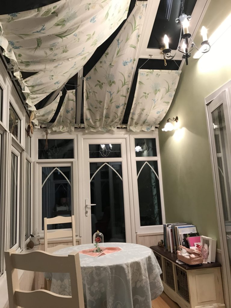 コンサバトリーです。今、雨が降っています。コンサバトリーの屋根に響く雨音は雨の音楽会のようです。天井もガラスなので、色々な雨音がします。ここは庭の花が見えるし、窓を開けると薔薇の良い香り、、。贅沢な空間です。午後3時すぎると、ステンドグラスに光が当たって素敵な影もできます。一日中ずっとこの部屋にいたいな、、、。ローズ色の1人掛けの椅子とライムグリーンの壁も素敵ですよ!