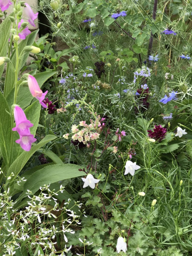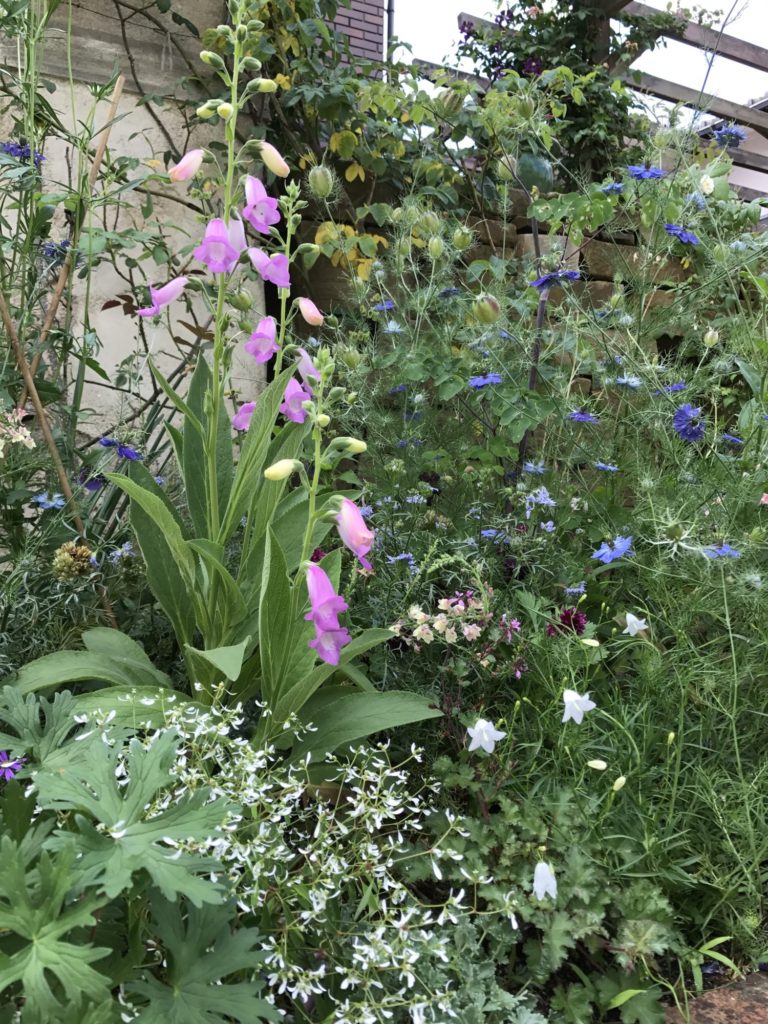 ジギタリス、リナリア、ニゲラ、カンパニュラ可愛いシーンで、心がなごみます。昨夜の雨で花いろが一段と美しいです。