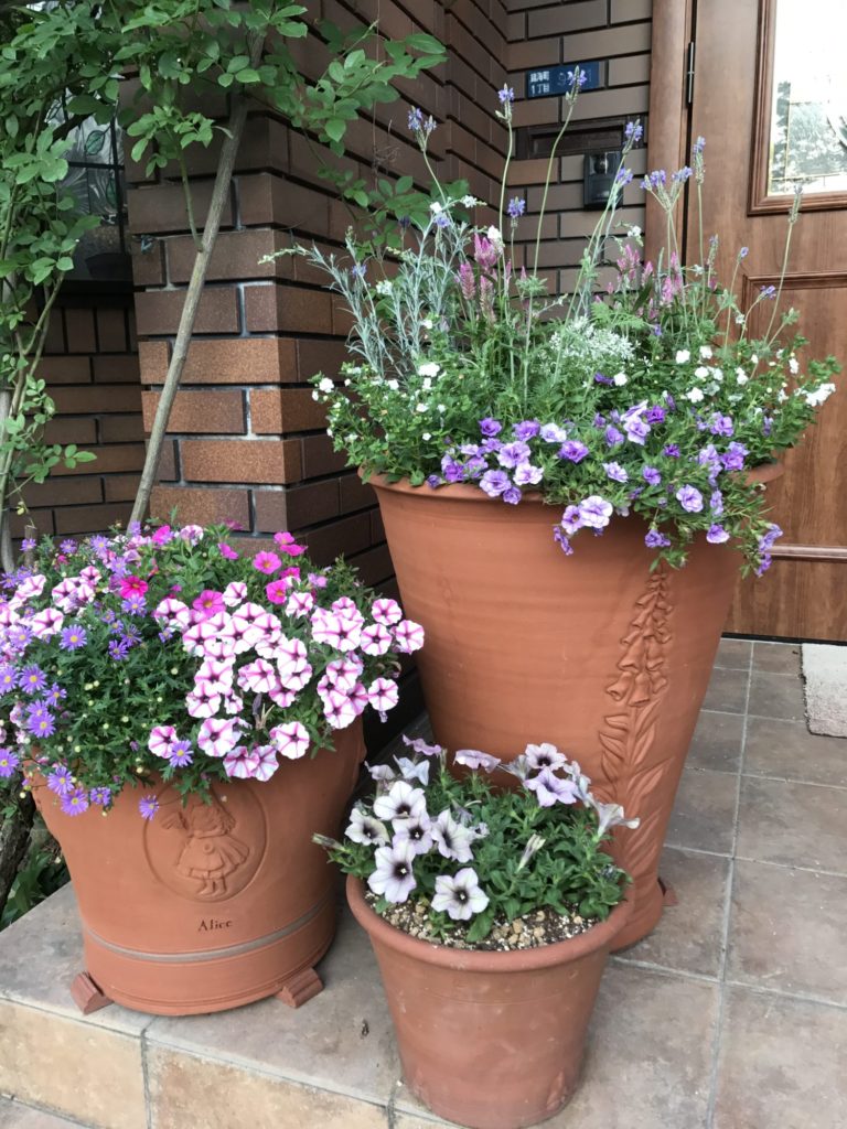 植え替えしました。レースラベンダーがかぜに揺らいで、いい感じです。暑いときに風に揺らぐ花は涼しげな気持ちにさせてくれます。毎日家を出るとき、帰るときに見る鉢なので、これでよかった!植えていた花は、色々なところに引っ越ししました。