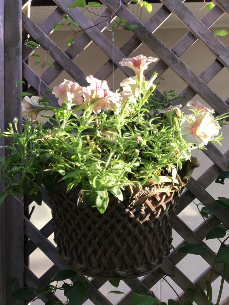 少し伸びすぎたペチュニアを切り戻しました。そのあと肥料まいておきます。でも、メインの鉢は切り戻したあと花がなくなるので、思い切って植え替えします。