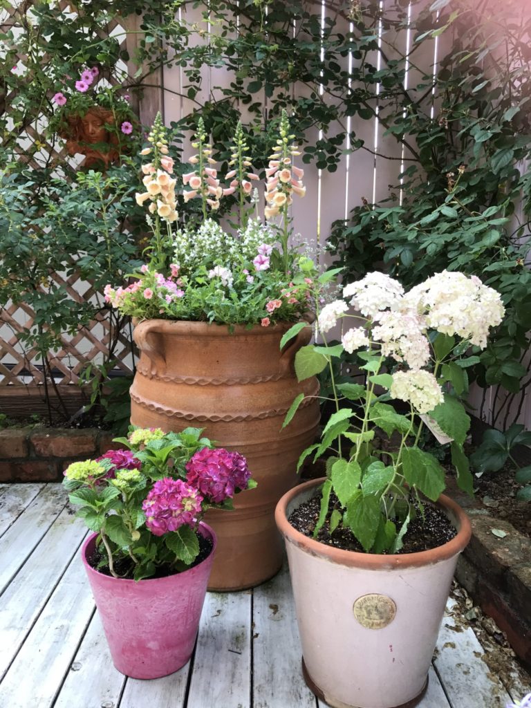 夏にむけて、寄せ植えを変えました。お花🌸は、隊長さんチョイスです。なかなか難しく、一度は植えましたが、今日、また直しました。まだ隊長さんのチェックはうけてませんが、クリニックのを真似てみました。紫陽花は買っても鉢植えでしょっちゅう水枯れさせてしまいます。今年はピンクを2つ買ってみました。それぞれピンクの鉢に植えて、頑張って水やりしてみます。自宅のデッキは昼から陰るので、紫陽花には過ごしやすいかもしれません。