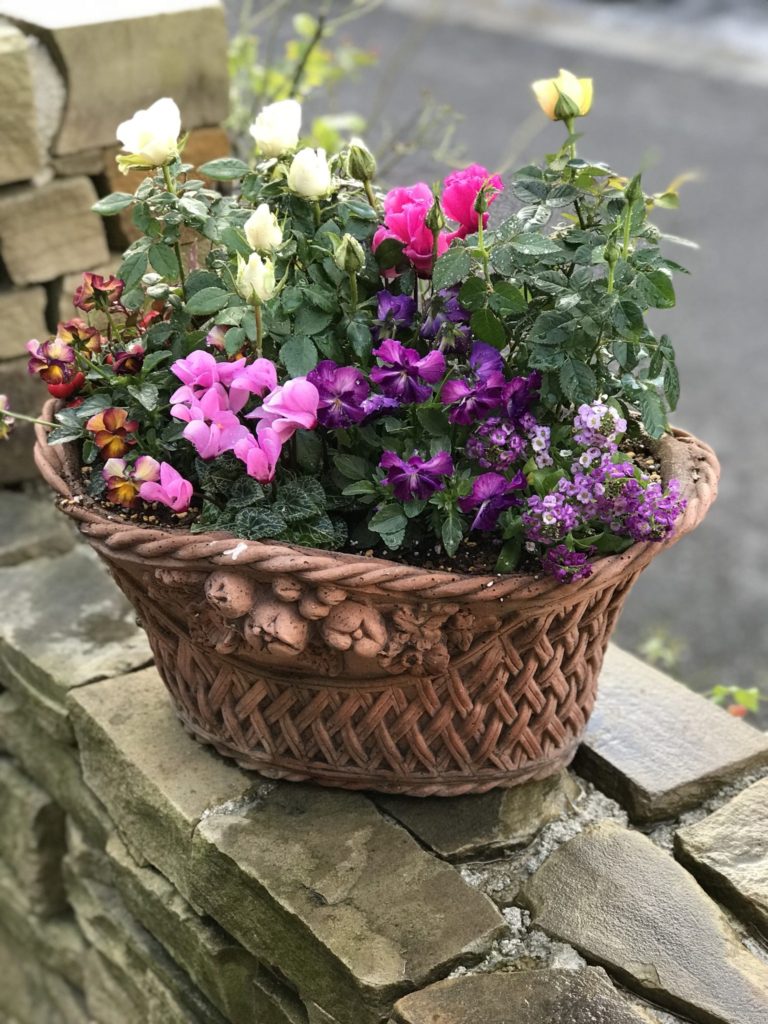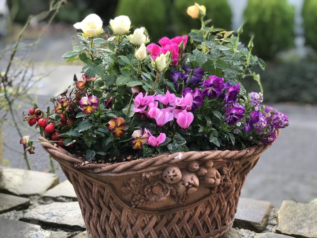 ミニ薔薇を使って寄せ植えしました。シクラメン、シックな色のビオラでなんとなくクリスマスの感じもしました。秋のミニ薔薇、気温も低いので、長い間花がたのしめます。