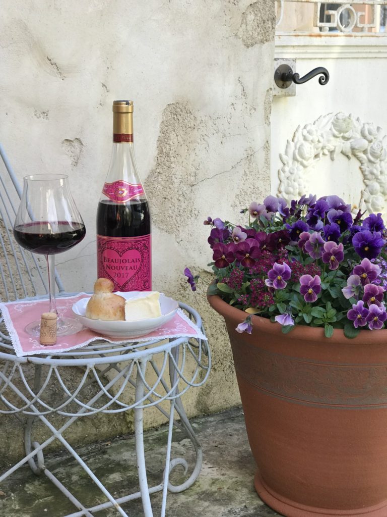今日は、ヌーヴォー解禁の日です。毎年素敵なラベルがあります。今年のお気に入りは、このハート!カロンセギュールを思わせるような、、。葡萄のエッジングの🍇鉢にワイン色の🍷花を植えて、画家の息子からプレゼントしてもらったバカラのグラス、マイセンのお皿、娘からもらったレースのハンカチと一緒に写しました。パンはこんにゃくを使って作ったブリオッシュ、チーズはパヴェダビノワ。至福のひと時です。