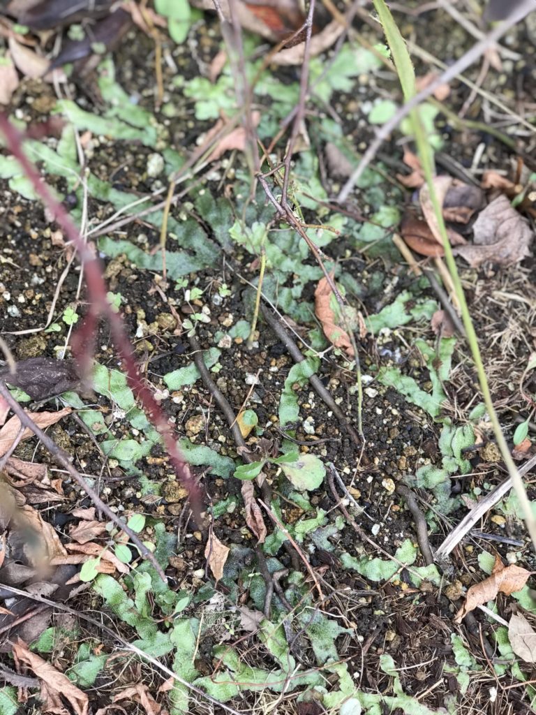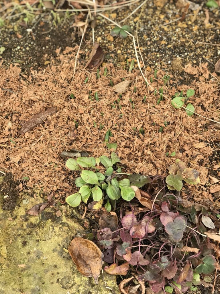 ここは、半日陰の庭です。原種シクラメン、雪割草、クリスマスローズなど、沢山植えてあります。日陰なので、アメーバみたいな苔が生える所があります。苔を取って、横山先生から教えていただいたベラポンをかけました。