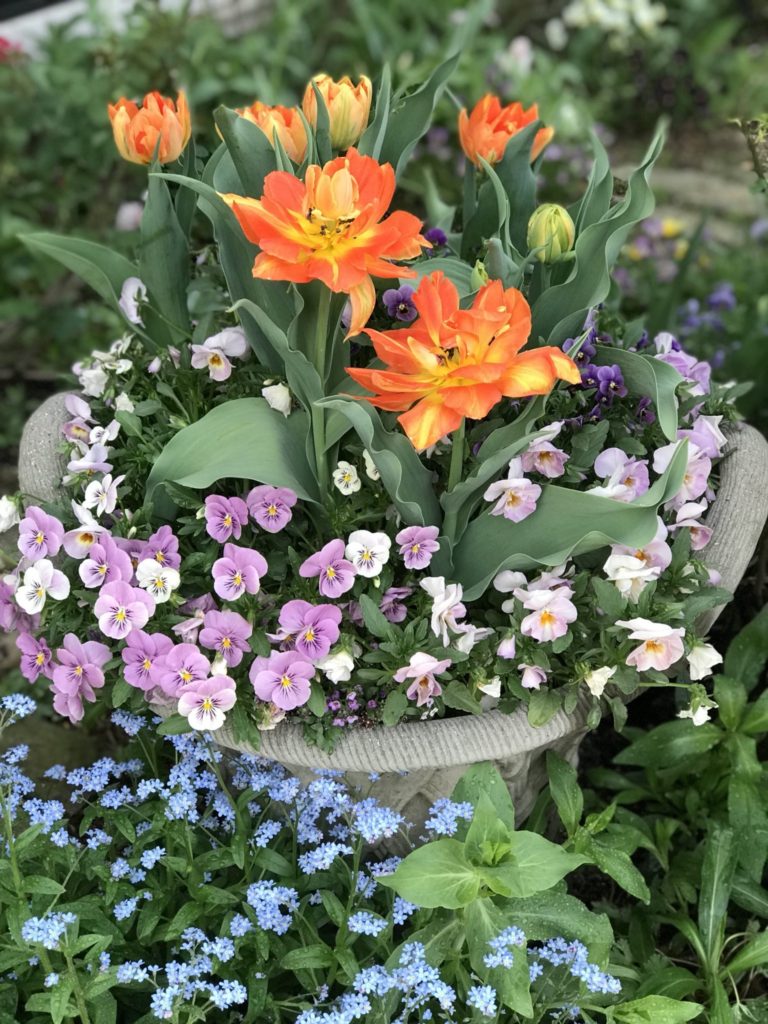 ビオラの寄せ植えからオレンジ色の素敵なチューリップが咲きました!薄紫とオレンジ!なんともオシャレな雰囲気です。毎日色々咲き始め、どこを撮していいのか、、、。困ります