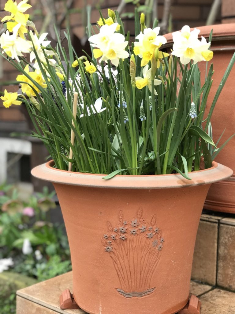 素敵な鉢です。球根を沢山植え付けて春を待ちました。暖かくなり、咲き始めました!可愛いです。