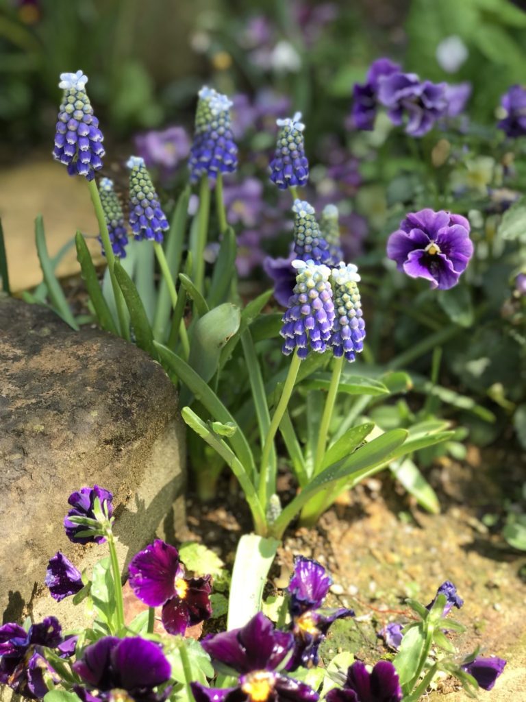 ムスカリに色々な種類があるんだなあと、、。ブルーもこんなに素敵なムスカリがありました!偶然にも紫のビオラを植えてました。ピンクのムスカリもピンクのビオラでした!可愛いです。