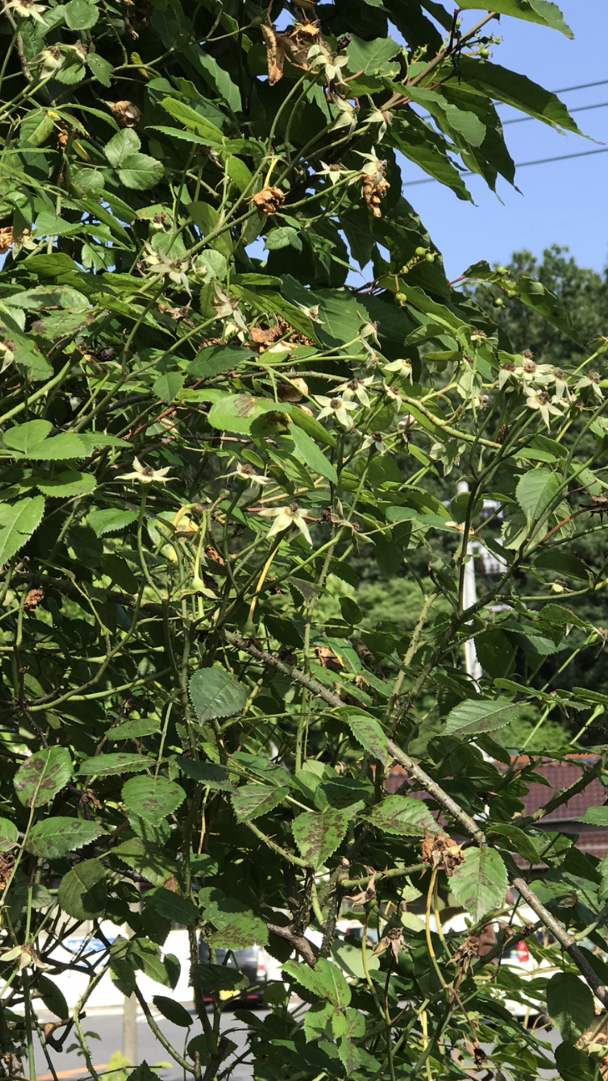 ローブリッター、スノーグースなどローズヒップを楽しむ薔薇におすすめな、花がらバンバン!軽い竹を薔薇の中に差し込んで、バンバン叩きます。この時期はもう枝がしっかりしているので少しくらいきつく叩いても大丈夫!玄関先は透明な傘で受けてゴミがでないようにします。傘にたまった花がらはゴミ箱にポイ!ホウキだと、隙間に入らないので軽い竹がおすすめです。星形のガクも可愛いです。